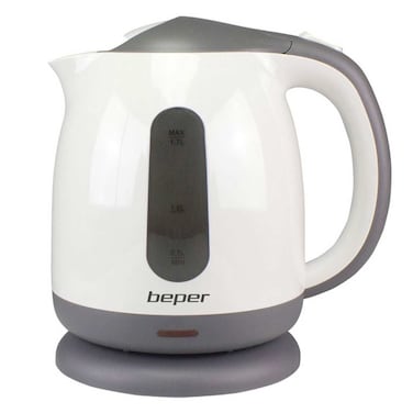 The electric cordless water heater (Beper P101BOL100) has a 1.7 liter jug with a water level indicator. Concealed heating elements and steel heating plate. It is equipped with a light, a removable filter against limescale, which can be washed in the dishwasher. Automatic shutdown when the temperature is reached and in the absence of liquids. It has a 360-degree rotating base with cable reel and overheating protection.
