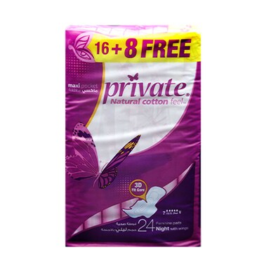 Private Natural Cotton Night Feminine Pads With Wings Maxipocket 16 + 8 Free